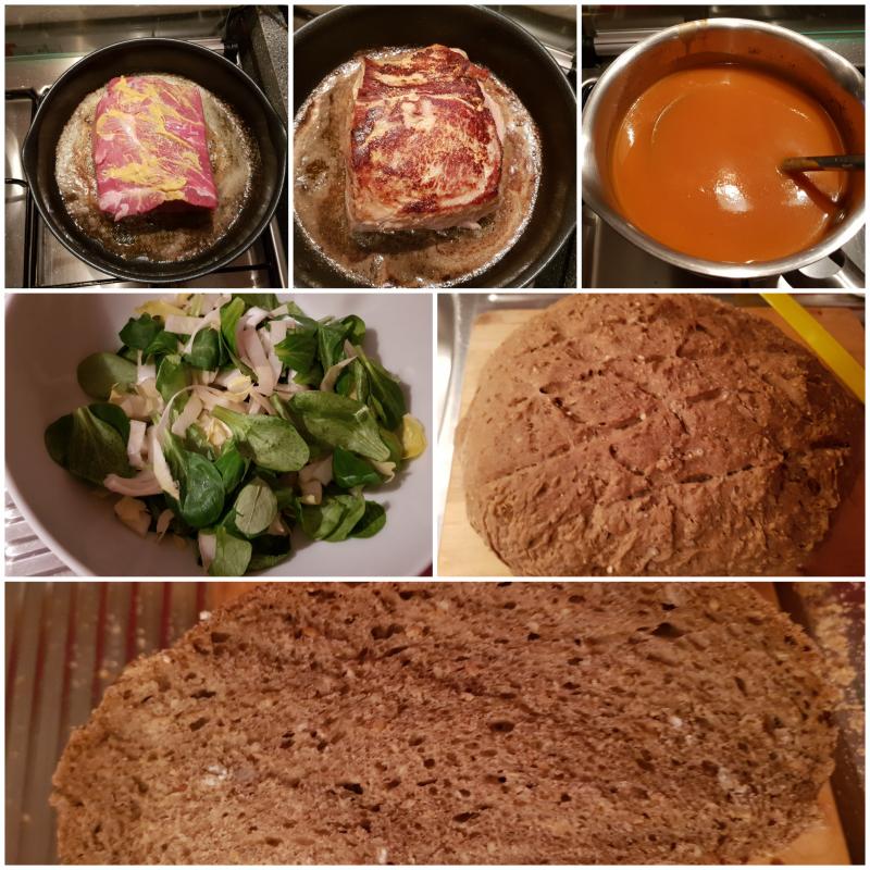Un roti de porc tartiné de moutarde Il faut pas que il fait froid pour faire un bon potage au tomates. Pour accompagner le repas une belle salade de saison salade de blé et chicons. Plus un beau pain Je vous souhaite une belle journée Lisette