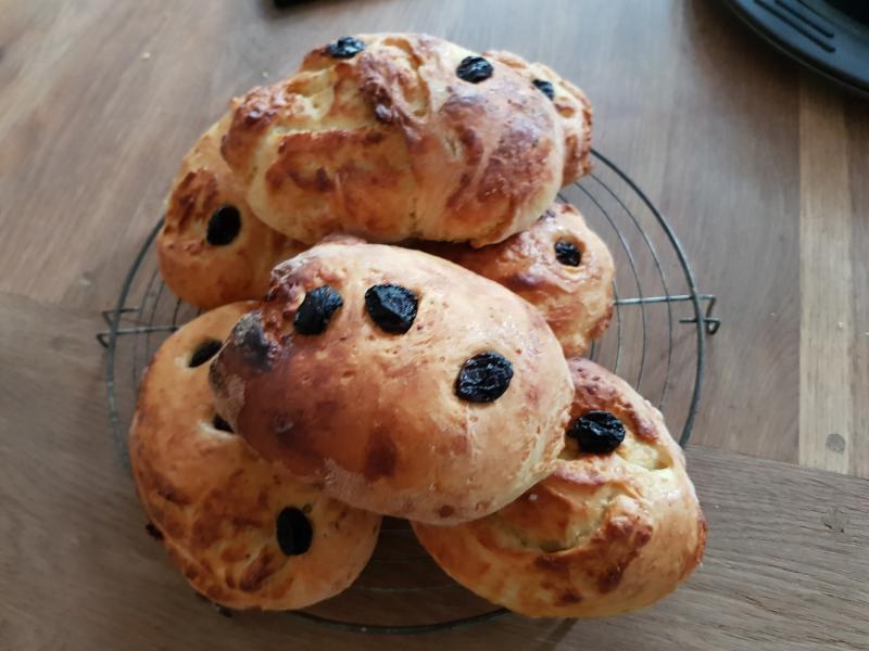 Je commence par delaier levure dans le lait puis ajouter les reste des ingrédients, bien malaxer en boule homogène. Deux repos puis façonné ses boules, laisser prendre forme et cuire 20 min a 210 degrés.....a surveiller