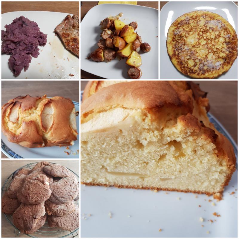 Une potée au chou rouge, des pommes de terre en robe de chambre risoler avec oignon et saucisses, un pain perdu réalisé avec un reste de baquettes, un gâteau au pomme