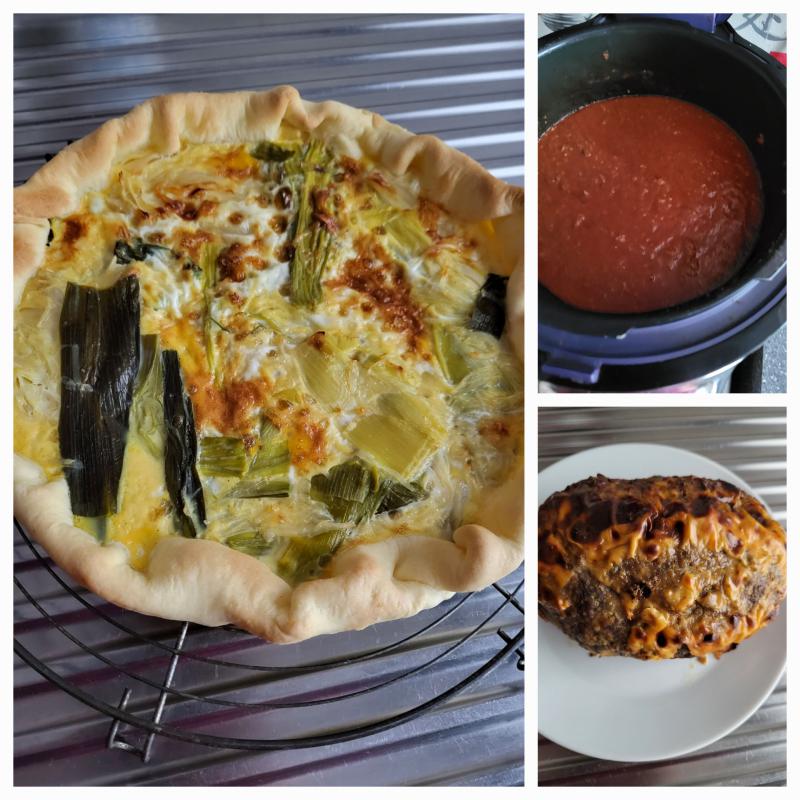 Ce dimanche jai cuisiner De la bolognaise, j'ai d'abord fait passer mon hachi de boeuf dans de huile d'olive saler poivre et epice a vos goûts ! Puis dans mon cookeo j'ai mis oignons cartons de tomates 🍅 et une boite de tomates pelé avec poivrons jai mis sel poivre et ail ajouter mon haché et fait cuire 25 min programme pression. Comme j'avais de haché de trop jai bien épicé ( le boeuf est fade si cest pas bien épicé) avec sel poivre ail oignon et persil poser deux tranches de fromage pour hamburgers. Fait cuire 45 min . Puis j'avais des poireaux frais couper un en 4 laisser cuire puis sur une pate brisé ( du commerce) poser le poireaux deux oeufs sel poivre fromage et cuit 25 min Je me suis servie des jeunes pousse de salade d'hiver Bonne semaine a toutes