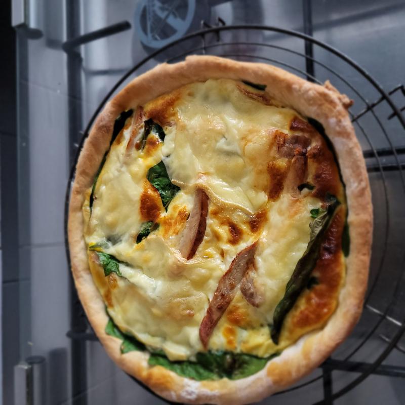 | Pour Une Quiche il faut faire ube petit pâte avec farine levure fraîche et un peu de lait . Vous la faites comme vous aimez.  Dans le fond j'ai mis des feuilles d'épinard ( du jardin) Deux œufs mélanger avec un peu de crème sel poivre et verser Puis j'ai mis 3 tranches du fromage et laisser cuire 20 min a 190° Bonne soirée