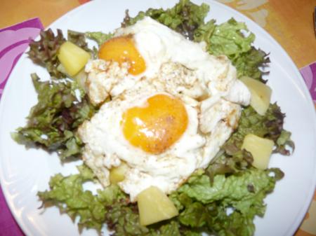 C'est tout simple,une belle salade frisée,qualle que pomme de terre et dessus deux oeufs .......jen vous dit pas comme je me suis régaler !!!!