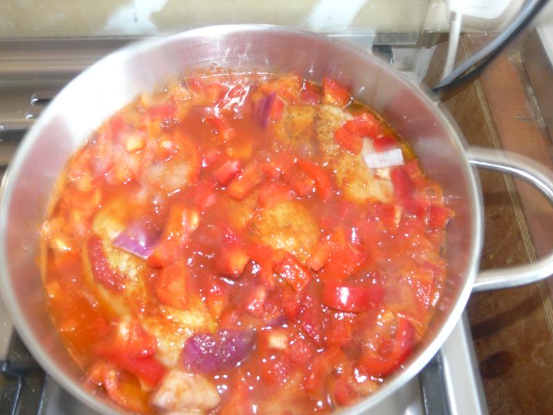 Dans une marmite je fait Risoler mes Poivrons,oignons puis je retire Je met risoler mes Cuisses,salé poivré.Je ajoute mes Poivrons,les oignons et je ajouté mes Tomates pelée.Je vérifie si c'est salé asser.Moi je ajoute deux gousse d'ail aussi et je met du Poivre de Cayenne.Sur un feu doux je laisse mijotée une bonne heure.Nous on a déguster avec du Riz.