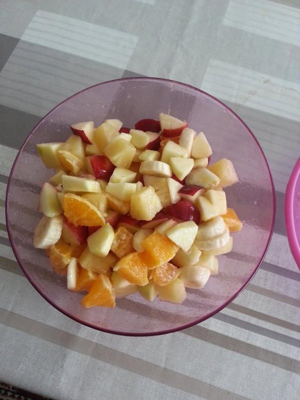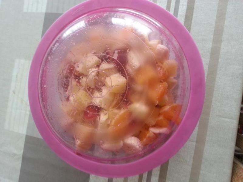 J'ai mis des pommes nectarine orange banannes et annanas .un peu de sucre^pas de trop !