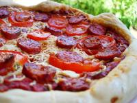 Étalez la pâte à pizza sur une plaque à four, répartissez dessus la sauce tomate tiède, le fromage râpé, les lamelles de tomate et de chorizo. Laissez reposer la pizza durant 30 minutes dans une atmosphère tiède et humide.