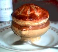 Coupez 6 cercles de pâte feuilletée (je prends une tasse comme coupe-pâte), dorez-les avec un peu d'oeuf battu (au pinceau) et collez-les sur les soupières. Faitez bien adhérer. Dorez-les aussi sur le dessus et réservez-les au réfrigérateur 2 heures pour que l'oeuf colle bien la pâte à la soupière (sinon la pâte va se rétracter et tomber dans la soupière).