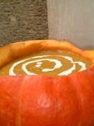 • Couper le chapeau, enlever les pépins et couper la chair en faisant bien attention de ne pas abîmer l'écorce (qui servira de soupière).