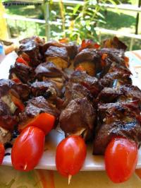 • Enfilez la viande dans des pics à brochettes en alternant avec le jambon et les légumes et en terminant par une tomate cerise. Faites cuire au grill 5 à 10 minutes suivant la cuisson que vous désirez.