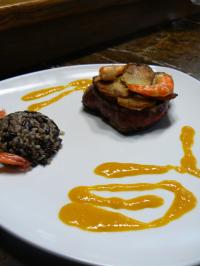 Filet de Boeuf aux Crevettes, Sauce Papaye et Gingembre - Pommes Dorées