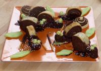 Déposez l'ensemble de la préparation dans un grand plat. Réalisez alors les yeux avec des petites boules en pâte d'amandes. Utilisez les billes en sucre multicolores pour garnir l'ensemble...