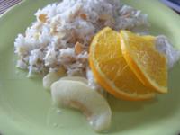 Pendant la cuisson, préparez le riz comme indiqué sur l'emballage. Faites revenir dans une noisette de beurre les amandes et ajoutez-les au riz. Servez sans attendre.