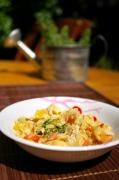• Faites revenir le tout dans l'huile. Lorsque l'ensemble est coloré, ajoutez la pâte de curry, la lotte coupée en morceaux ainsi que le lait de coco.