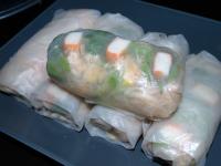 1 paquet de vermicelle « RICE STICK – ZHAO QING» (attention, il existe plusieurs types de vermicelles!) 1 paquet de galettes de riz (31 centimètre de diamètre) 500 g de porc nature en bloc (c’est du porc qui est emballé dans un emballage vert et qui ressemble à une feuille de banane) 1 paquet de surimis de 200 g environ (comptez un surimi par rouleau) 500 g de pousses de soja 1 concombre 1 batavia ou salade iceberg 1 bouquet de coriandre ciselé 1 bouquet de menthe ciselé