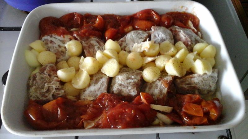J’ai préparé ce plat de tomates Complet Encore qq bocaux de tomates en conserves Des billes de pommes de terre Qq boules de chairs maison(des crépinettes Coupées en deux que j'achète à la ferme... Oignon ail herbes du jardin Sel poivre