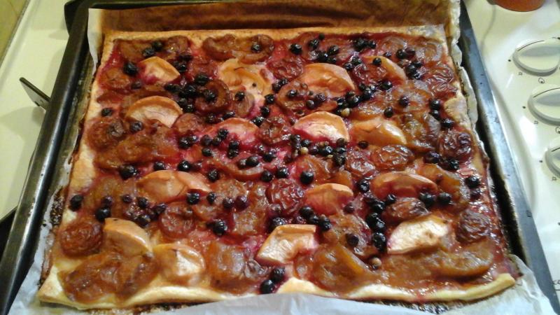 Une pâte feuilletée carree du commerce Des prunes de nos conserves été dernier Des prunes surgelées Des morceaux de pommes acidulées Des cassis surgelés de l’annee dernière Un peu de sucre roux Au four 45 mns Ho! Quelle est belle pour l’heure du thé Passez si vous êtes dans le coin😉🏡☕ Bon dimanche hé sous la pluie