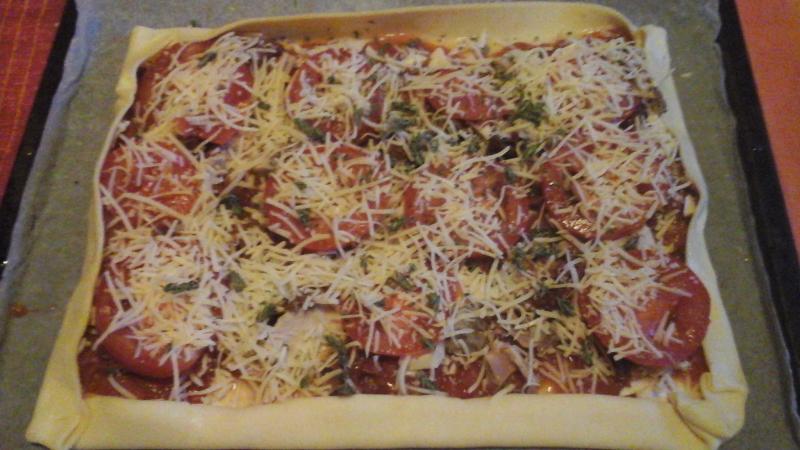 De poulet les restes donne naissance à un nouveau plat ici un fond de pâte feuillettée sur lequel j'ai déposé un petit bocal de mes tomates en conserves égouttées mon reste de poulet coupe fin 1 échalotte ciselée finement des tomates fraîches des tomates confites à l'huile pimentée Du gruyere râpé un peu de thym parsemé et du poivre 5 baies passée au four un excellent repas du soir