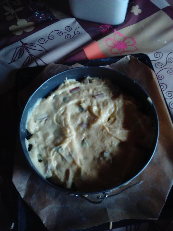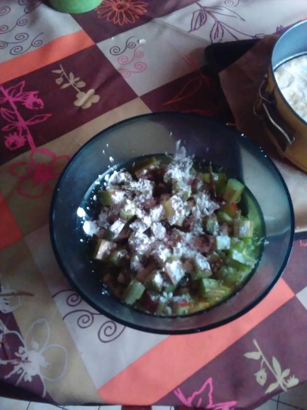 Mélange la rhubarbe eb des avec maïzena et sucre roux