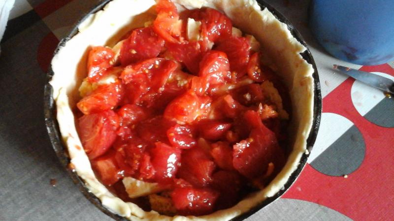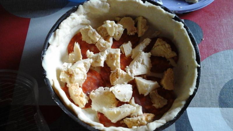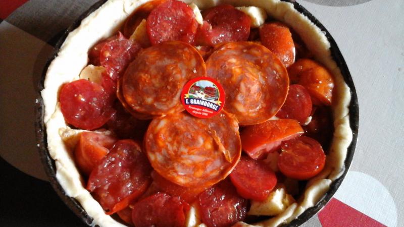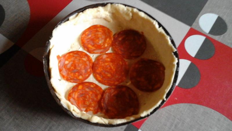Donc j'ai préparé une pâte brisée maison sur le fond j'ai déposé des rondelles de chorizos du livarot en mx des tomates du jardin pelées cuite un peu dans une poêle antiadhesive pour ne pas avoir trop de jus égouttées je fais deux couches je termine par qq tomates fraîches au four 45mns