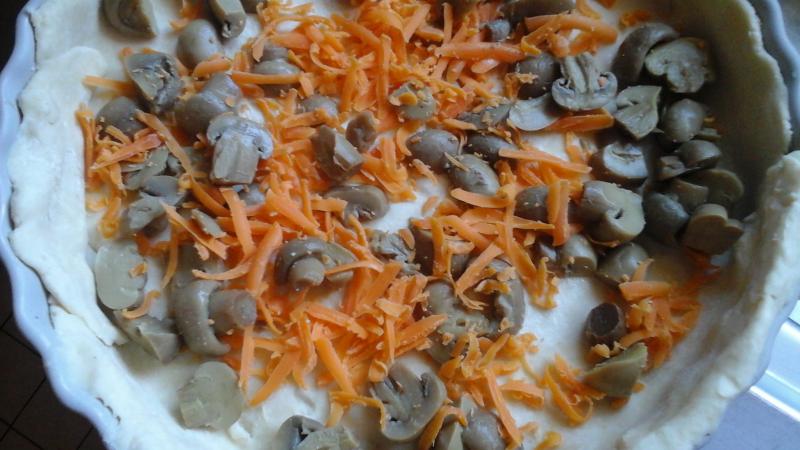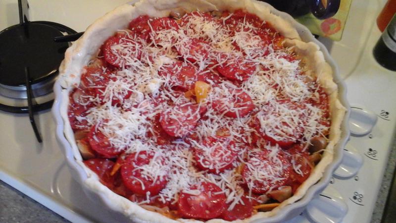 Une pâte brisée maison faites dans mon robot des champignons frais un ptit morceau poivron orange des tomates du jardin poelee à l'huile d'olive et avec une grosse échalotte du potager poivre faire un peu compoter à couvert