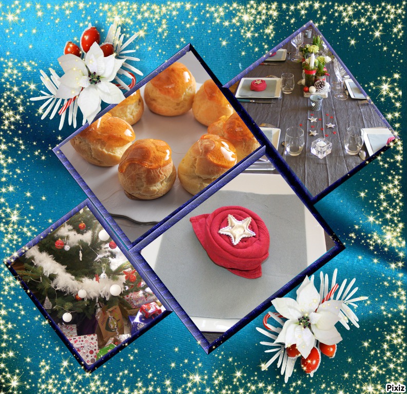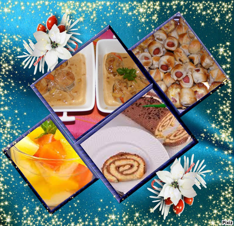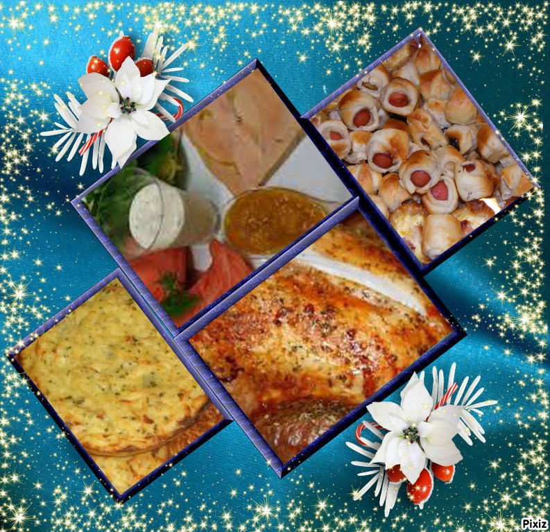 Midi 8 à table Petits feuilletés au boudin blanc et minis saucisses assiette terre mer dinde rotie au palets de pommes de terre salade fromage bûche du patissier au chocolat