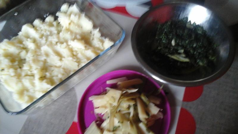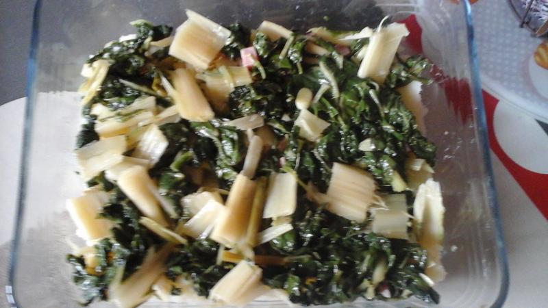 je monte mon plat purée feuilles de blettes les côtes découpées en mx des dés de jambon blanc je répéte l'opération sur 2 couches je termine par de la purée et du gruyére que je râpe épicé en fonction de vos goûts