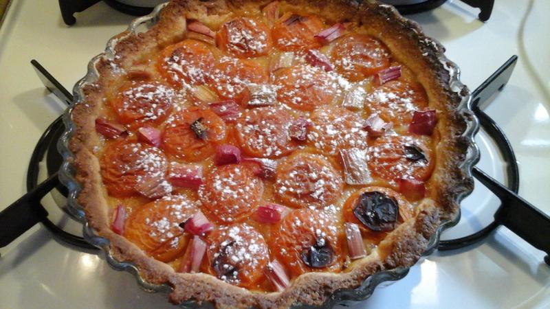 Une tarte sur pâte sablée avec qq dés de rhubarbe