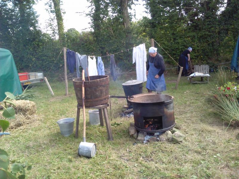 UN LAVOIR RECONSTITUE POUR LE FESTIVAL LA SOUPE AUX LEGUMES CUIT TOUT A COTE ET LES CONFITURES CUISENT DANS LE CHAUDRON