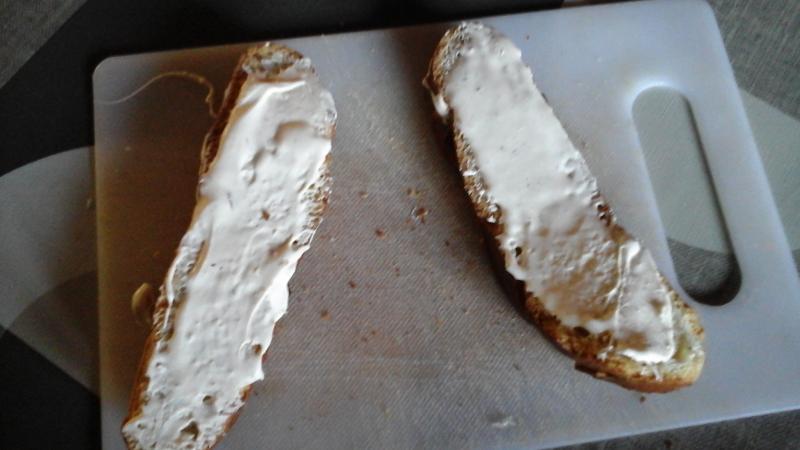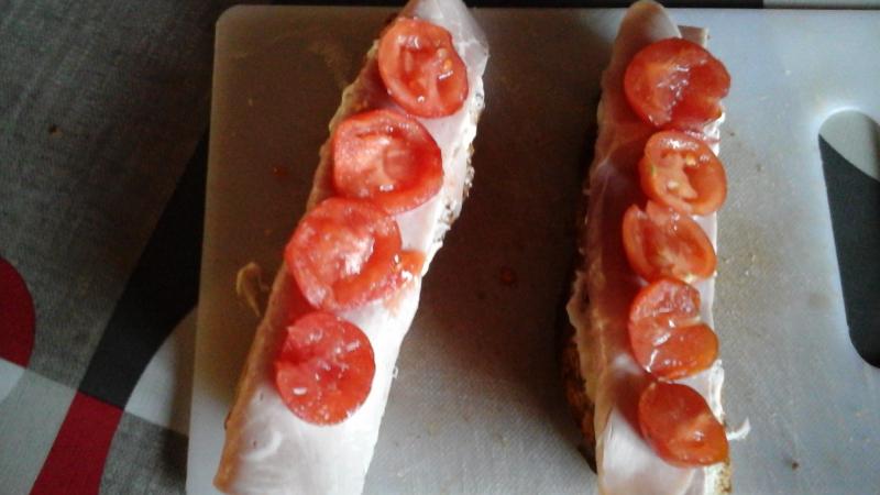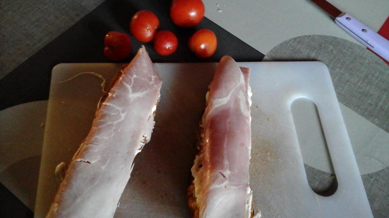 Une tranche pain de campagne Un peu de crême épaisse de Normandie Une demi tranche de jambon Des tomates du jardin cette fois c les dernières Un peu de râpé