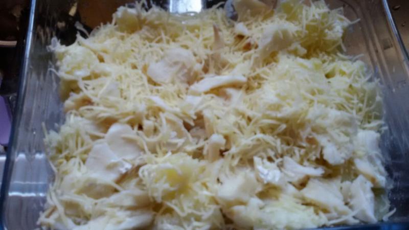 DES POMMES DE TERRE CUITE A LA PEAU EPLUCHEE DETAILLEE EN MX UNE BRIQUE DE CRME LIQUIDE MES MORCEAUX DE MORUE PAR DESSUS UN PEU DE POIVRE DU GRUYERE ET AU FOUR 30MNS A GRATINER