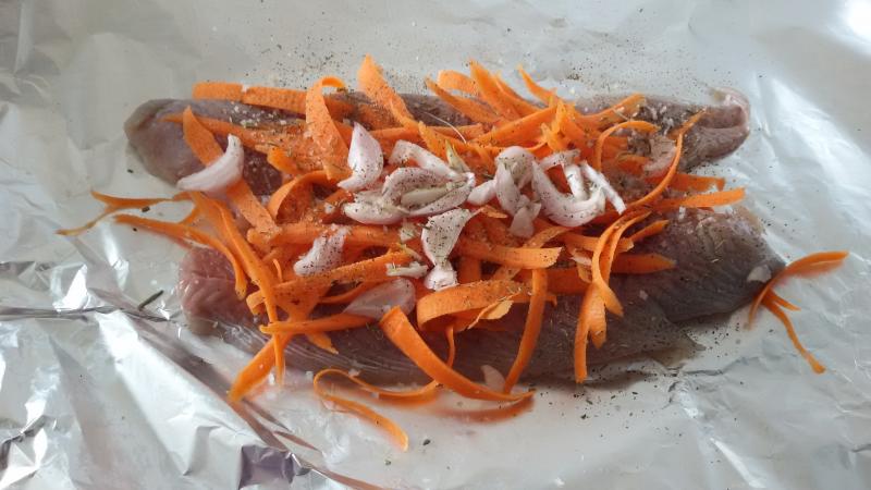 Que j'ai cuit en papillottes avec des lamelles de carottes de l'échalotte du jardin