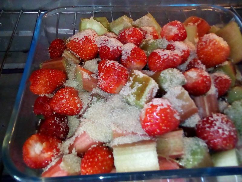de la rhubarbe des fraises du jardin pour une compote au four avec du sucre roux