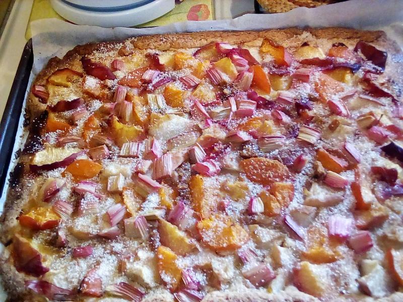 Pour des amis qui passent a l'heure du thé ou café une pâte sablée maison Des pêches des abricots et rhubarbe j'ai émiétté deux spéculos un peu de sucre roux