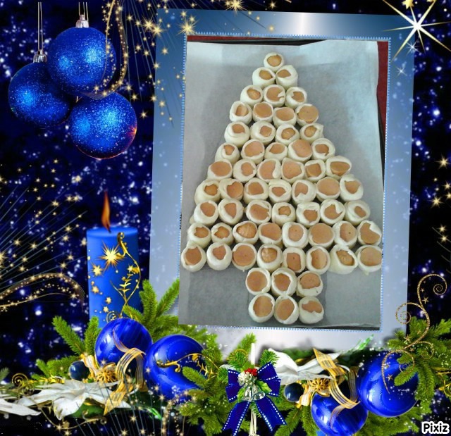 une pâte feuillettée j'ai tracé un sapin au crayon à papier à l'envers de ma feuille cuisson ensuite on fait des petits roulés avec des saucisses coktails et boudin blanc en mélange que l'on place en commencant par le haut