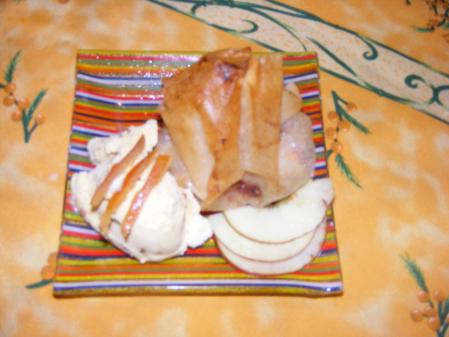 petit dessert ultra simple ,1 feuille de brick beurrée au beurre salé,dans une poele ,qq pommes caramélisées dans du miel chaud, les déposer au centre de la feuille de brick la refermer avec un pic cure-dents à four chaud th 8 - 1o mns, mettre 1 boule de glace vanille l'aumonière de pommes et qq pommes crues en lamelles pour faire joli i i i i i i i i i i i i i i i i i i .............................
