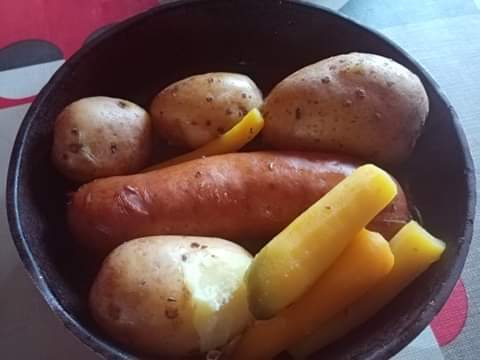 Pommes de terre et carottes cuitent dans le bouillon de la saucisse