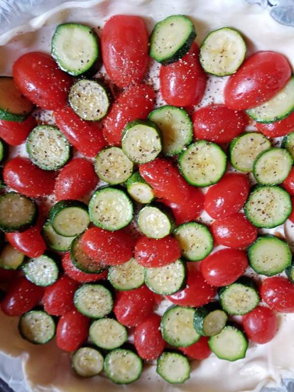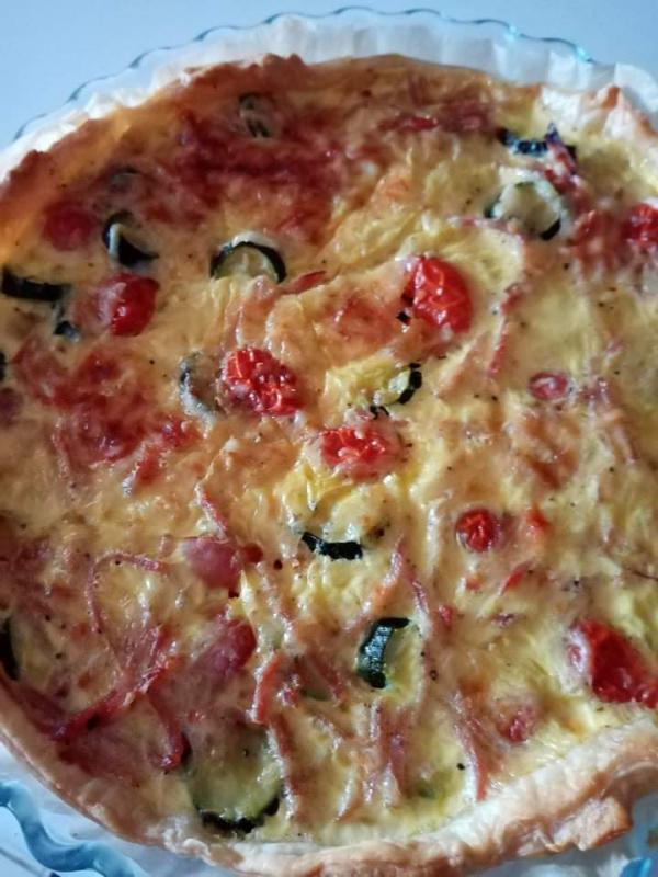 Quiche courgette tomates cerises pailles de jambon