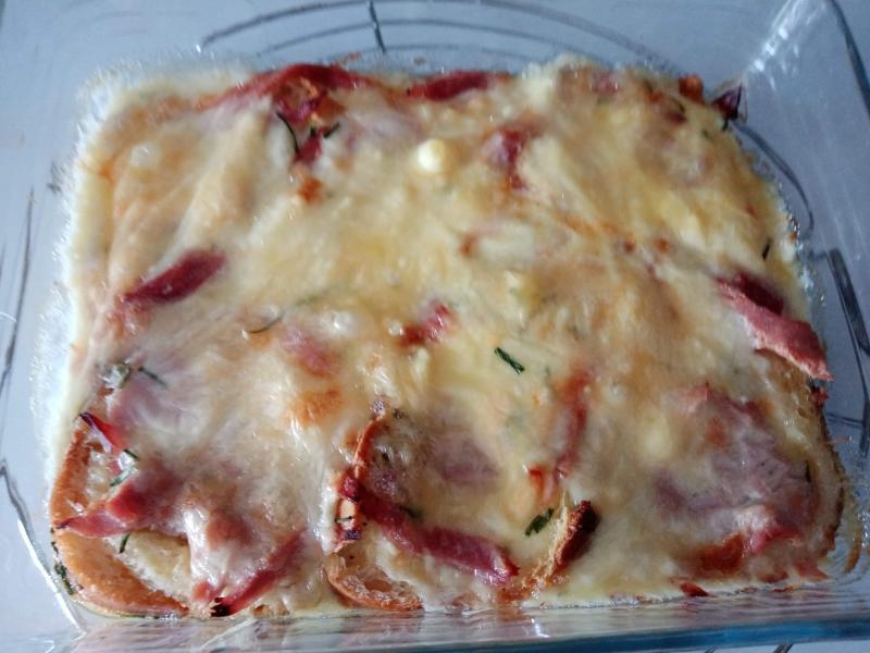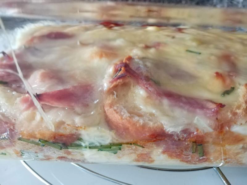 Ingrédients :100 g de pain 80 g de jambon blanc 3 œufs Ciboulette 100 g de reblochon 30 g de beurre 50 cl de lait Sel, poivre Préparation :Comment préparer ce Pain perdu montagnard au Reblochon ?Battre les oeufs le lait tiède sel poivre mettre pain au fond du moule Qq noisettes beurre ou tartiné Le jambon en lanières Verser là 1ére préparation Ajouter le reblochon Au four th 220 pour 30 mns environ
