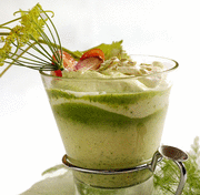 répartir le velouté de cresson dans les verrines ,puis verser délicatement le velouté d'ail sur le velouté de cresson, et terminez par qq cuillères de crème fouéttée,décorez, d'1 brin de coriande,1pincée de cumin 1 tomate cerise,
