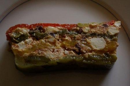 dans un moule à cake montez la terrine en disposant une couche de poivrons