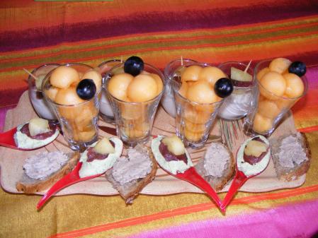 verser la préparation dans vos verrines ou cuillères apéritives j'ai mis un mx de pommes et mx de magrets canard sur le dessus des cuillères( voir photo)