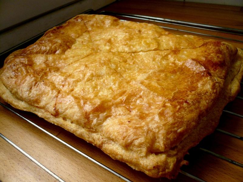 au bout de ce temps diviser votre pâte en deux étalez en formant un carré un autre carré avec le reste la pâtefaire revenir 800grs de pommes dans un peu de beurre salé pour que les pommes s'écrasent sous la cuillèrelaissez refroidir et mettre cette compotée de pommes sur le 1er carré de pâte que vous aurez déposez sur une feuille de papier sulfurisé et farinémouillé le pourtour de votre pâte couvrir avec le 2éme carré et fermé dorer à l'oeuf ou lait le dessus de votre pâte,laisser reposer 30mns au fraiscuire th 210 ou 7 environ selon fourlaisser refroidir ou tiédir et servez avec la sauce caramel