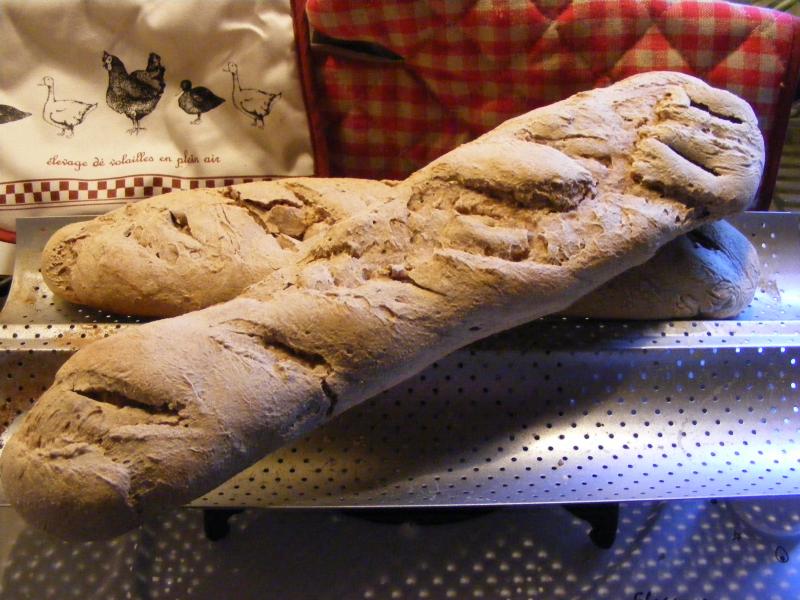 J'ai testé mon moule à Baguette ou a tuile une fois retourné! 2 en 1 donc voiçi mes 2 ptits pains craquants que je gouterai demain matin 500grs farine aux céréales bio 350ml d'eau tiéde 10 g de levure fraîche délayée dans 2 cuilléres à soupe d'eau 1 cuillére à café de sucre car ça donne un coup de pouce à la levure j'ai fait cuire 45 mns four maxi avec 1 petit bol d'eau pour créer de la vapeur