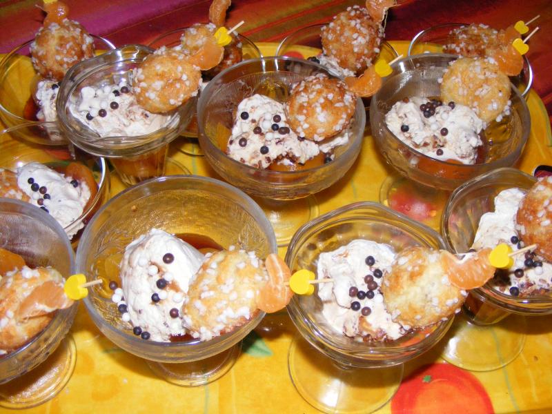 En famille petits apéritables feuilletté de St Jacq sauce corail poule au blanc fromage coupe glacée vanille noix de pécan sur crême de cassis et abricots