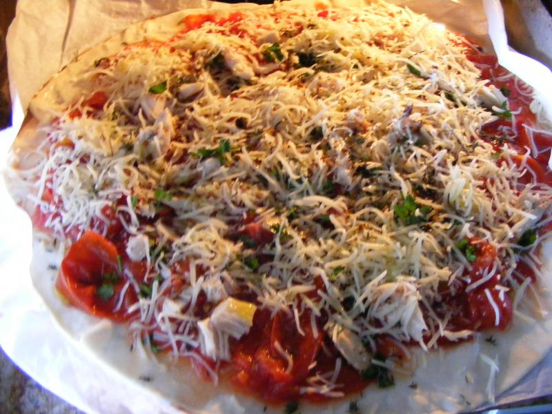 un reste de poulet des tomates de mes conserves de l'été dernier un sachet de gruyére un peu de thym parsemé du poivre 5 baies au four avec une petite salade pour ce soir