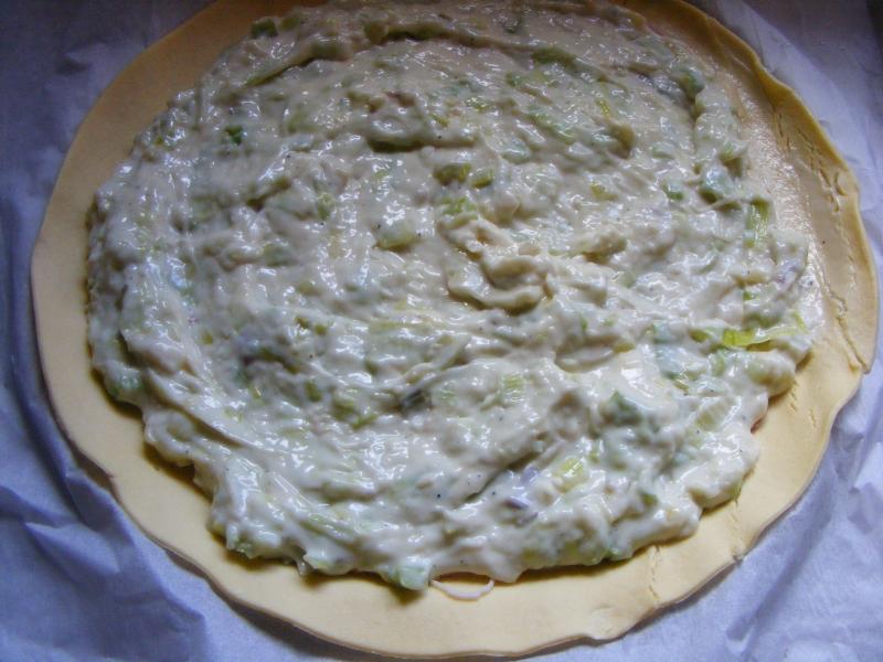 le mettre dans votre béchamel garnir une plaque a four de la pâte brisée piquée là humidifier là autour (2cms) mettre 2 ou 3 tr de jambon blanc dessus verser la préparation aux poireaux