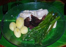 - 4 filets de turbot sans la peau (120 à 130g /filet) - 1 botte d'asperges vertes - 40g de morilles séchées - beurre -20 cl de crème fraîche - 1 pincée de filaments de safran, sel, poivre Laver les asperges ; retirer la base et faire cuire le reste 15 minutes à l'eau bouillante ou à la vapeur Arroser les morilles d'eau chaude; les faire gonfler 20 minutes; les égoutter; bien les rincer. Saler et poivrer les filets de turbot et rouler chaque filet sur lui-même en les maintenant avec un pic en bois. Les placer dans le panier d'un cuit-vapeur et cuire environ 10 minutes. Faire revenir les morilles dans un peu de beurre, saler et réserver au chaud. Ajouter la crème fraîche à laquelle on ajoutera les filaments de safran (saler, poivrer) et laisser réduire. Au moment de servir, déposer sur chaque assiette quelques asperges, un filet de turbot (ôter les pics), une cuillère de morilles. Napper de sauce safranée et servir aussitôt . (on peut ajouter quelques petites pommes de terre vapeur, comme sur la photo)