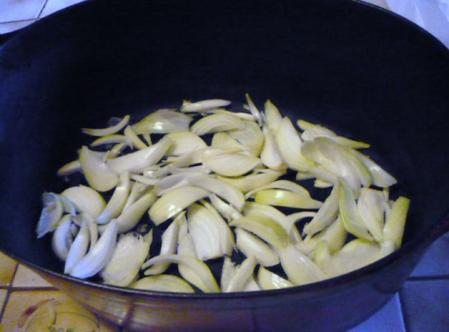 Les oignons couper en lamelles dans le fond de la cocotte