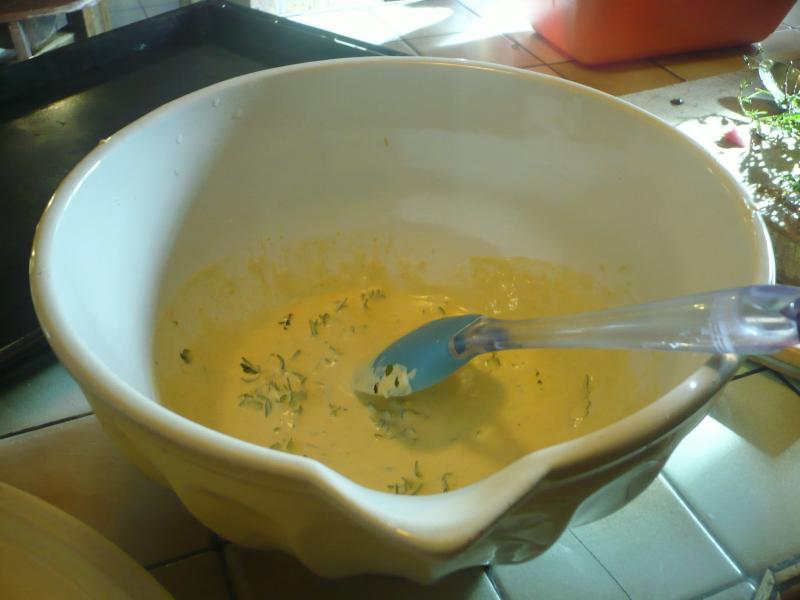Faire la sauce, en mélangeant, créme, moutarde, herbes,
