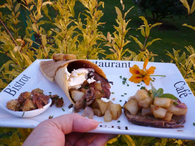 Présentation en assiette(chaude), avec des petits croutons de quatre-quarts KER CADELAC (en cuillère) deux rondelles, d'andouille, une fleur(couleur d'automne), et deux cuillères à soupe de fruits. décoration, ciboulette, menthe a la pomme.