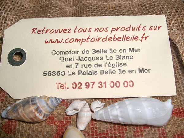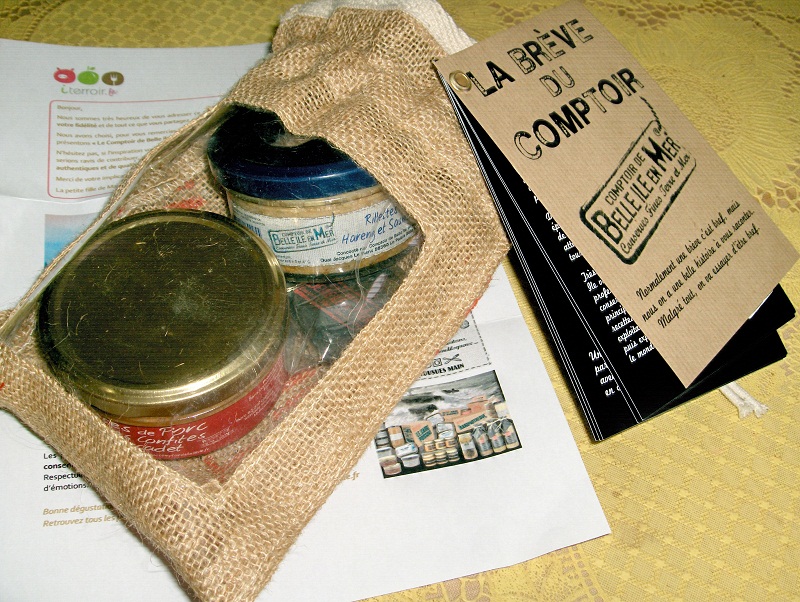 - un bocal de rillettes de porc, tomates confites et muscadet. - un bocal de rillettes hareng et saumon. Quelques coquillages, un porte-clé et l'histoire du Comptoir de Belle île en Mer accompagnaient ces gourmandises.
